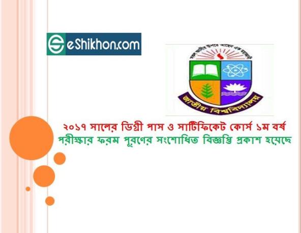 ২০১৭ সালের ডিগ্রী পাস ও সার্টিফিকেট কোর্স ১ম বর্ষ পরীক্ষার ফরম পূরণের সংশোধিত বিজ্ঞপ্তি প্রকাশ হয়েছে