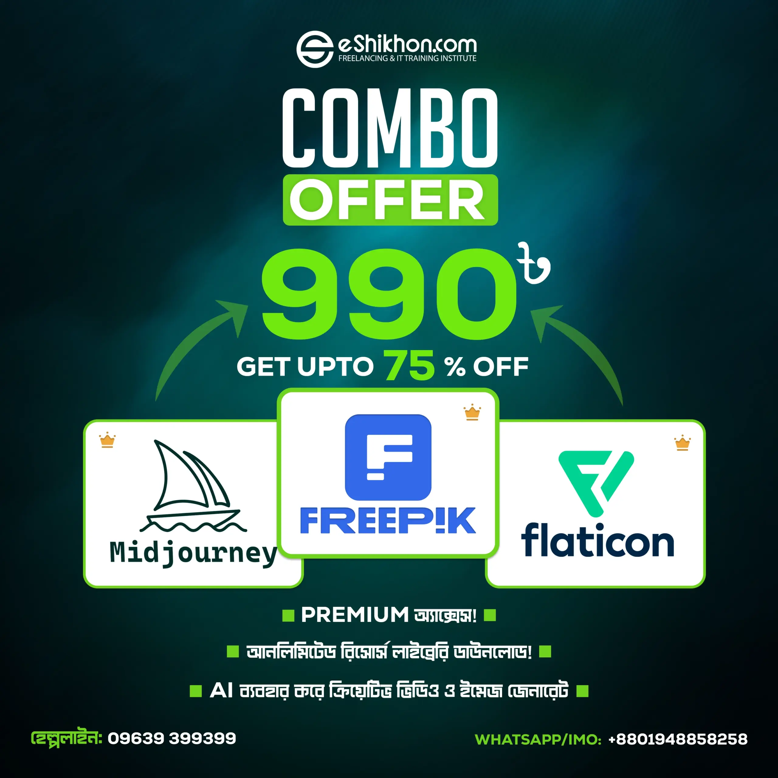 eShikhon-এর শিক্ষার্থীদের জন্য স্পেশাল গিফট! মাত্র ১০০০ টাকায় শিক্ষার্থীরা পাচ্ছে Premium Freepik, Midjourney & Flaticon Combo Pack । একসাথে পাচ্ছেন ডিজাইন, AI আর আইকনের অল ইন ওয়ান সল্যুশন!